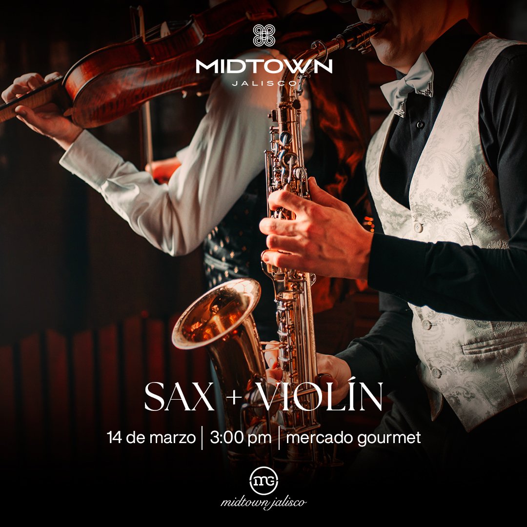 Una tarde para disfrutar de música en vivo con Sax y Violín. Déjate llevar por una experiencia musical única. 📍 Mercado Gourmet 📅 14 de marzo | ⏰ 3 PM