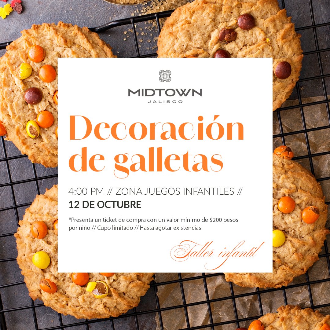 Convierte tus galletas en obras de arte. Este domingo 12 de octubre a las 4 PM, participa en nuestro taller de decoración de galletas en la zona de juegos PB. Presenta un ticket de al menos $200 por niño – ¡Hasta agotar existencias!